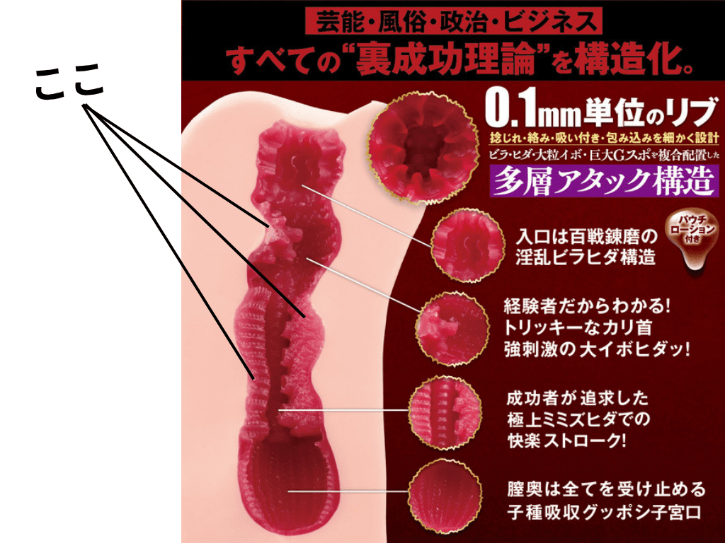 という触れ込みなので、ついリアル膣触感を想像しがちですが、内部構造の断面図をみるかぎり、リアル膣とはとうてい呼べない構造。